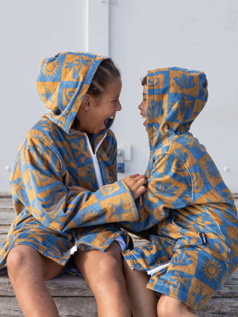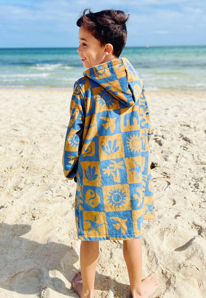 The ultimate hoodie for the ocean adventurer. Covered in a hand-drawn checkered graphic pattern, this hoodie screams island surf vibes. Warm, natural tones of bluestone and cinnamon makes this a rad towel hoodie for any kid.