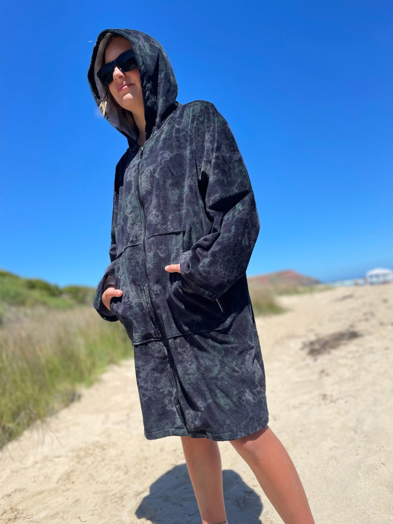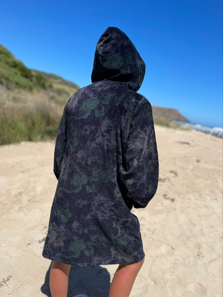 Looking for something a little darker, then you've got the right design! This hooded towel features a subtle stormy pattern with tones of black, grey, green & khaki.