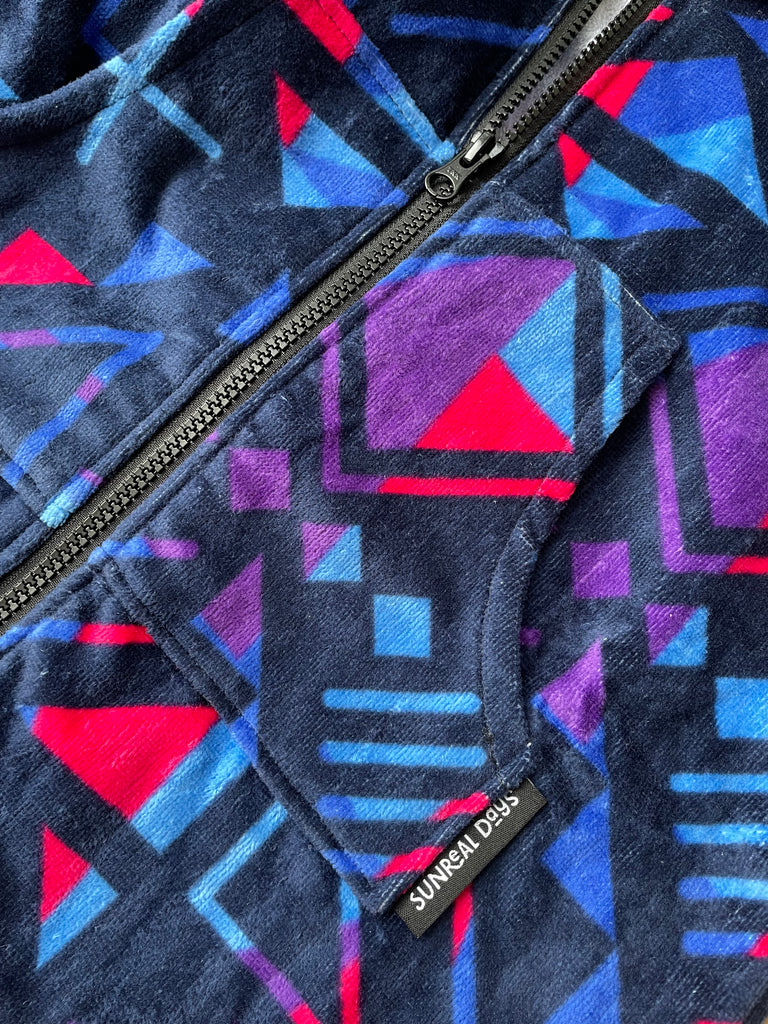 This plush Towel Hoodie is covered in geometric shapes, it's dark and moody with grey-blue background. Fluro red, purple and blue feature on this design.