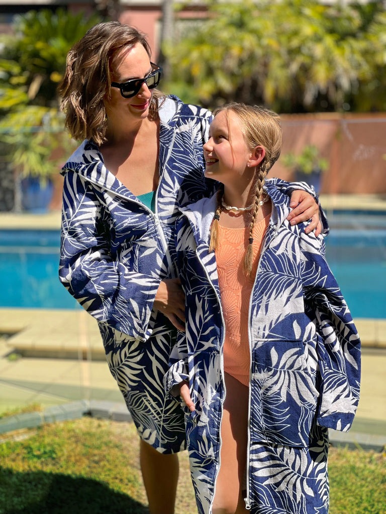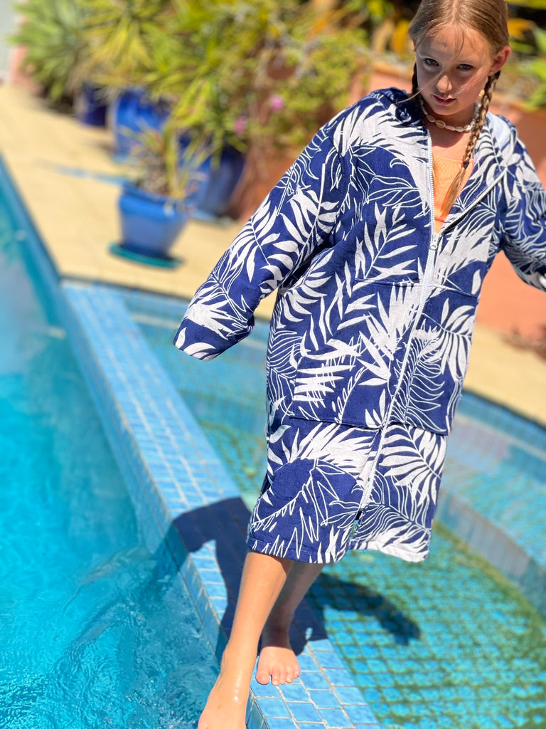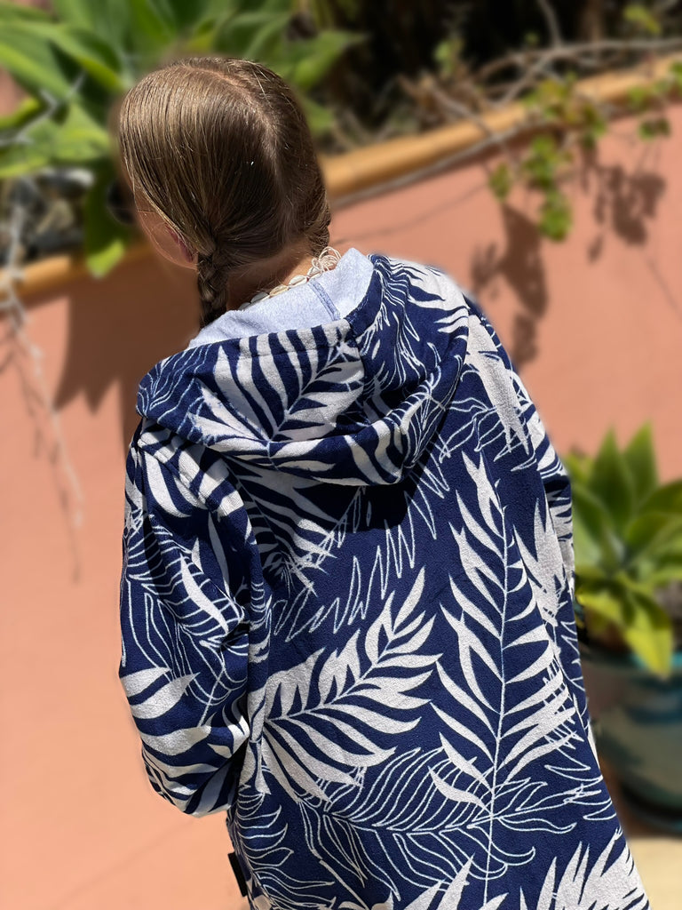 Drift away into pure relaxation with our Navy Tropics Towel Hoodie. Featuring a timeless navy and ivory palm leaf design, this classic colour combination is effortlessly stylish and loved by all.