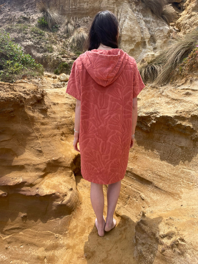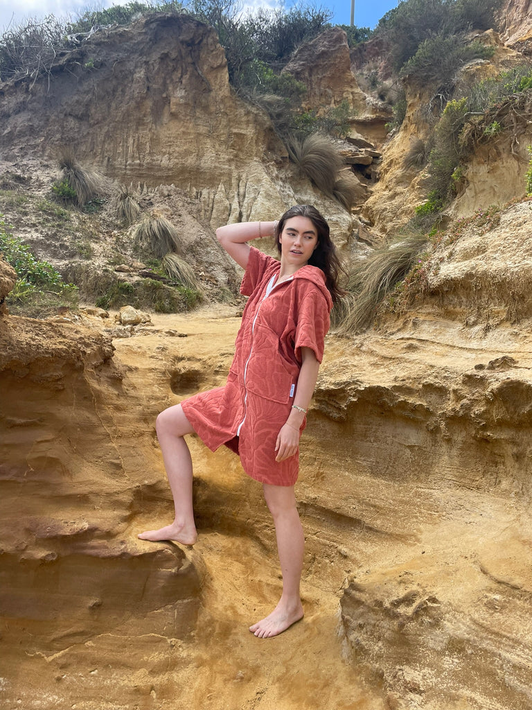 Our famous Zipper Towel Hoodies now available in a fresh short-sleeve cut. She’ll dry you off after a dip and double as a cute changing robe. 100% cotton terry towel as always, in a textured floral finish.
