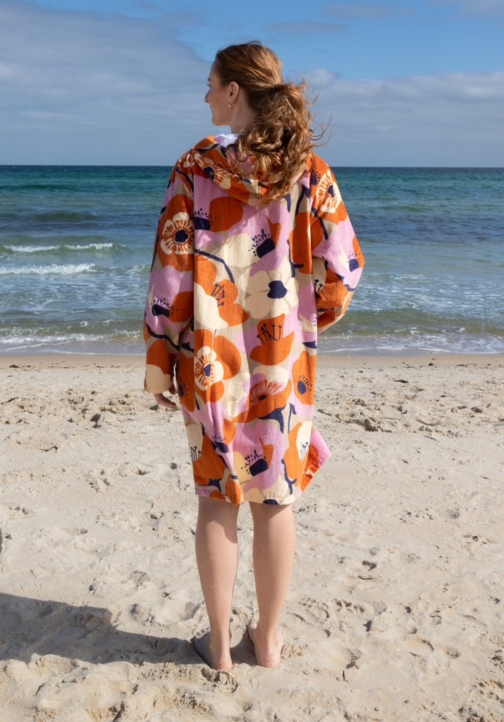 Why should kids have all the fun? Finally, a stylish swim robe for the BIG kids. The Vintage Floral print adds a touch of nostalgia and fun. This bold, retro pattern features a hand-drawn bouquet of warm, natural tones combining burnt orange, pink, navy and cream.