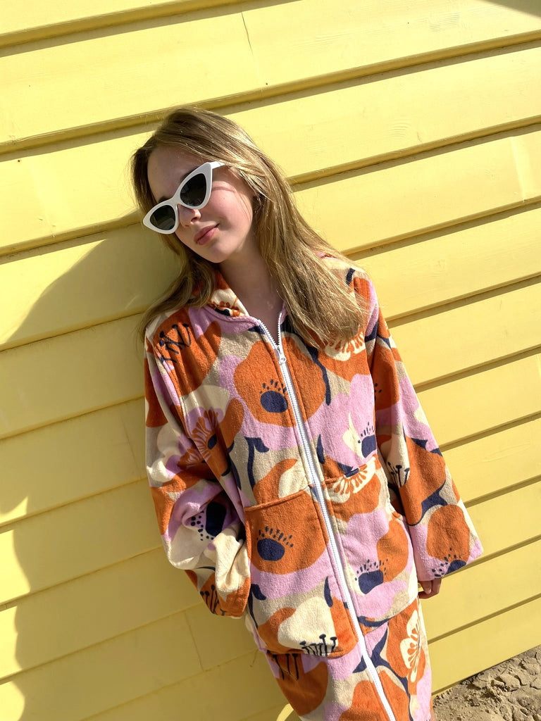 A perfect towel hoodie for a little flower child. The vintage floral print adds a touch of nostalgia and fun! This bold, retro pattern features a hand-drawn bouquet of warm, natural tones combining burnt orange, pink, navy and cream.